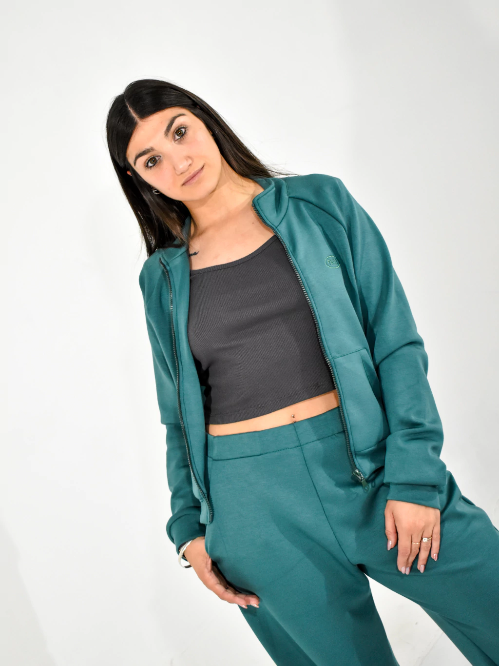 PANTALÓN FLUIR, en color verde esmeralda confeccionado en un algodón soft con spandex, tiene un tacto muy suave con una caída espectacular. Este artículo posee elástico en la cintura, bolsillos en el delantero, modelo tiro alto y en su lateral el bordado a tono de la marca. El jogger que no te vas a querer sacar. Viene en talles S - M - L. La modelo esta con talle M.